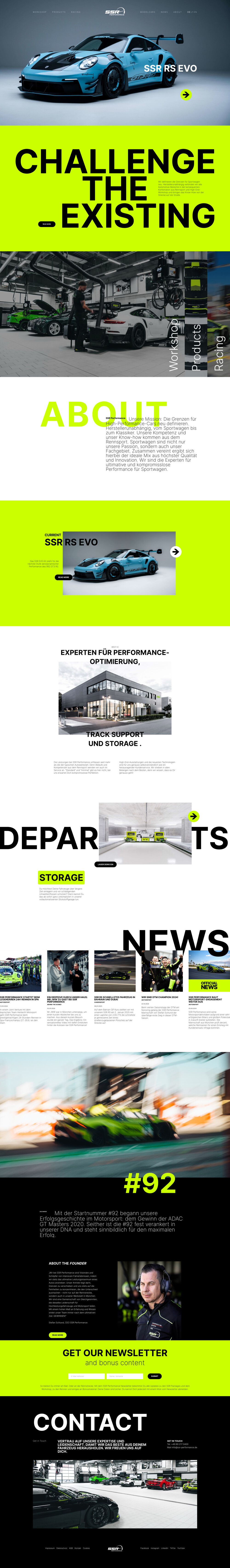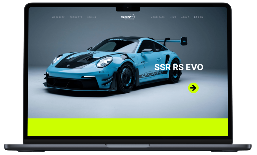 Für SSR Performance aus München realisierten wir eine digitale Präsenz, die die Leidenschaft für High-Performance-Fahrzeuge und Motorsport authentisch transportiert. Die Plattform vereint die Werkstatt, den Rennsport und exklusive Produkte in einem klar strukturierten, responsiven Auftritt. Dieses Projekt wurde in enger Zusammenarbeit mit MOONWORK umgesetzt, wodurch Design und Funktionalität perfekt aufeinander abgestimmt sind.